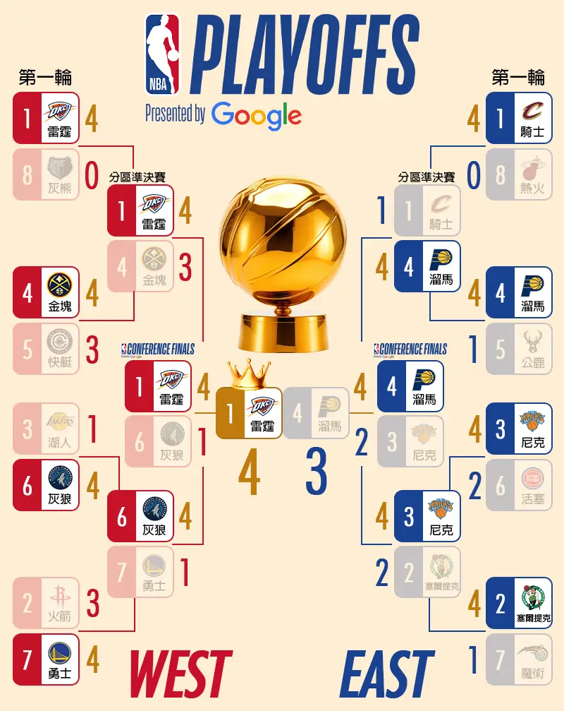 2025 NBA總決賽由「 東區 溜馬 」對上「 西區雷霆 」!