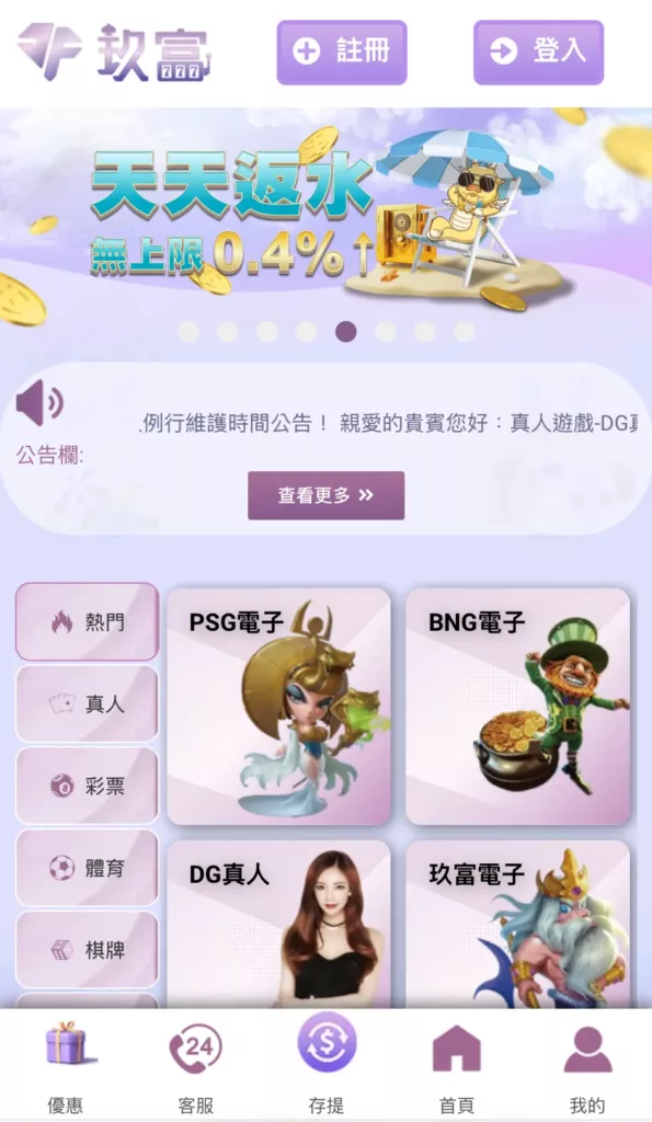 - 遊戲類型: 電子老虎機、真人百家樂、真人視訊、運彩下注、台灣彩票遊戲、捕魚機遊戲