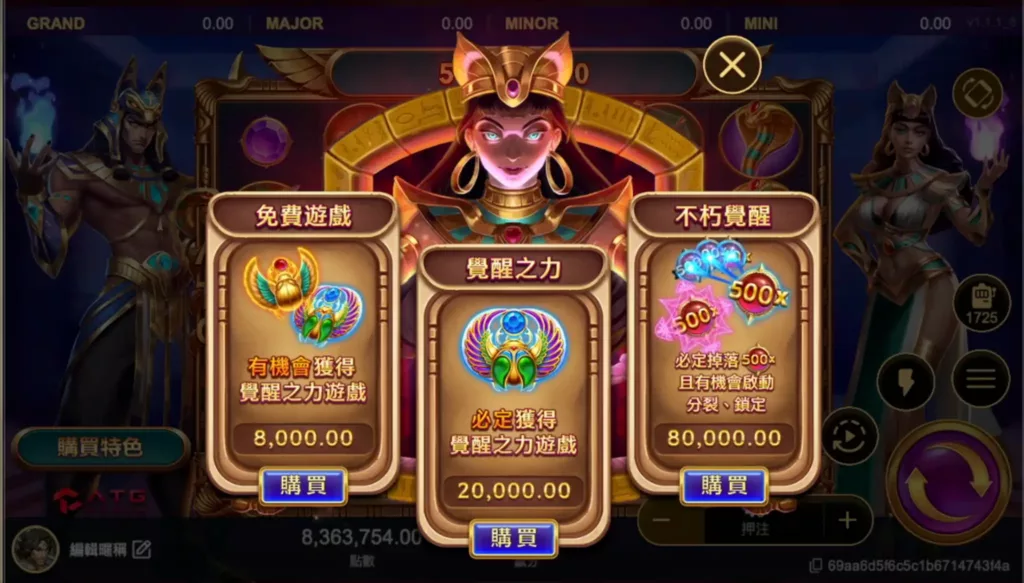 左側的戰神賽特與右側的奈芙蒂絲,不只是裝飾角色,更是這款遊戲主題感的重要來源。賽特的造型偏力量與戰鬥感,奈芙蒂絲則帶有神秘與覺醒氣息,兩者剛好呼應遊戲裡的力量覺醒與鎖定覺醒概念。這種左右角色包夾盤面的設計,也讓中央遊戲區更像是一座正在被神力操控的古埃及戰場,視覺張力相當明顯。