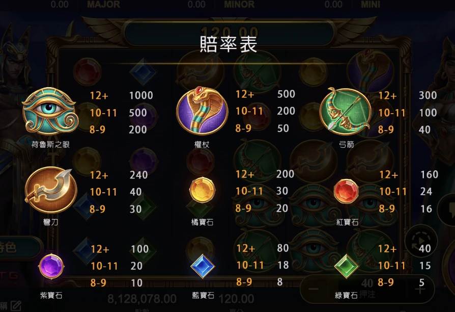 中央區域是整款遊戲最核心的位置,也是玩家主要觀察符號掉落、消除、連續得分與特殊效果是否觸發的地方。盤面採用直向多軸排列,高分符號、一般符號與特殊符號都會集中出現在這裡。從介面設計來看,符號本身的辨識度相當不錯,高分圖示像荷魯斯之眼、彎刀、弓箭、權杖都很容易一眼分辨,而寶石類一般符號也用不同顏色做出清楚區隔,玩家在看盤時不太容易混淆。